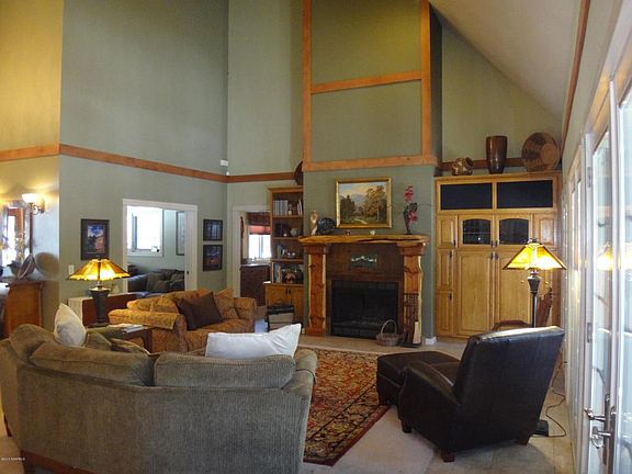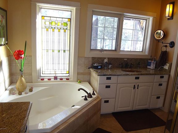 Great ponderosa pines surround this Hidden Hollow custom home offering 5.45 acres located in desirable west side location. The exterior is Tudor style and the newly remodeled interior is mission style with many Frank Lloyd Wright (FLW) accents for that southwest yet elegant styling. Kitchen was remodeled with granite countertops, KitchenAid appliances, and updated lighting and custom FLW fixtures. Home has two fireplaces with FLW accents. Soaring cathedral ceilings in living room and large windows leading to covered back deck add room for spacious indoor or outdoor entertaining. Main level master bedroom and master bath have dual person shower and garden tub. Formal dining room could be used as a 4th bedroom. There is a great laundry/pantry and large workspace and storage. See More..