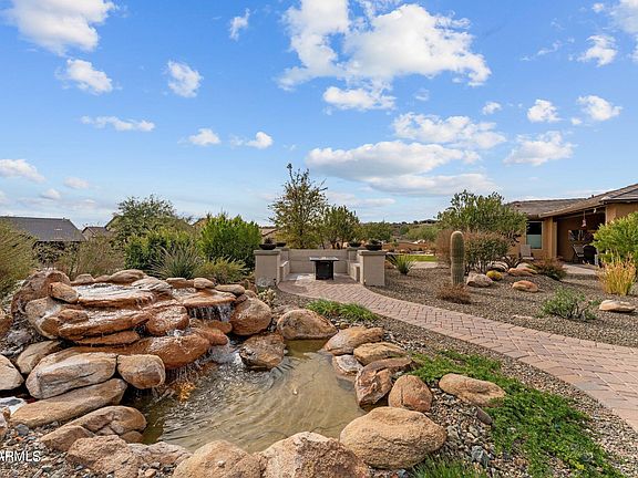 Welcome to 3385 Rising Sun Ridge! This 2 bedroom, 2.5 bath with den Brasada floor plan offers just under 2,200 square feet of well-designed living space, showcasing modern comfort, gorgeous mountain views, beautiful tile, brand new carpeting, and significant upgrades throughout the home. The open floor plan, abundant natural light, and gourmet kitchen create an inviting ambiance for both everyday living and entertainment. The 3-car tandem garage also offers plenty of space for parking and/or storage. This property also boasts an extraordinary backyard, perfect for entertaining, with a dazzling water feature, a firepit with ample seating, an outdoor kitchen perfect for desert night cookouts, a covered fireplace for cozy nights, and a putting green to perfect your golf game. Amenities include a beautiful golf course, fitness center, a resort swimming pool, and much more. Don't miss the opportunity to make this incredible home yours. Experience the luxury and tranquility of Wickenburg Ranch.