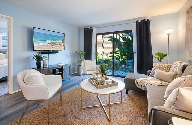 Ideal location! Single level, main floor condo-home. No steps! Located less than one mile from Dana Point Harbor and Doheny Beach. Live like you're on vacation year-round in this charming community and comfortable main level condominium. Beautiful pine trees and meandering streams run throughout, truly setting the tone for resort like setting. Entering this condo-home, you will appreciate the upgraded and fresh features. This condo has a spacious open floor-plan, double door entry to master bedroom, walk-in closet and full bathroom. On-site amenities include: pool, jacuzzi, sauna and private access to a fitness course and the San Juan Creek trail where you can walk or bike ride to the shores of Doheny Beach!! Ample guest parking and reserved parking for the tenant. Water included! This really is the ultimate location to enjoy the beach lifestyle. PLEASE note: current pictured furniture is not included. Two flatscreen TVs (one in bedroom, one in living room) will be included with a one-year lease.