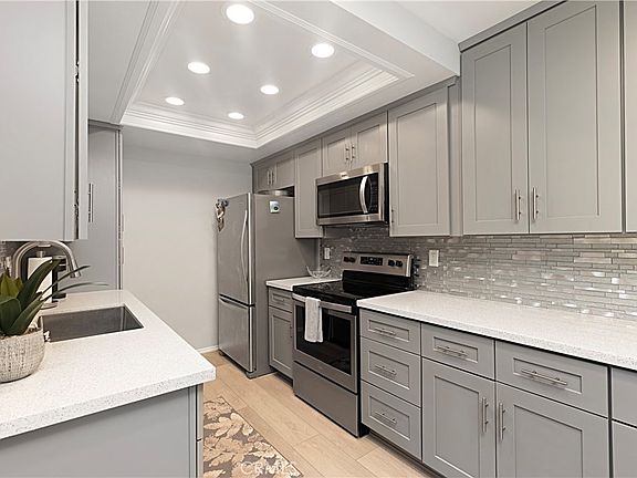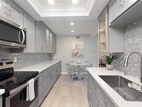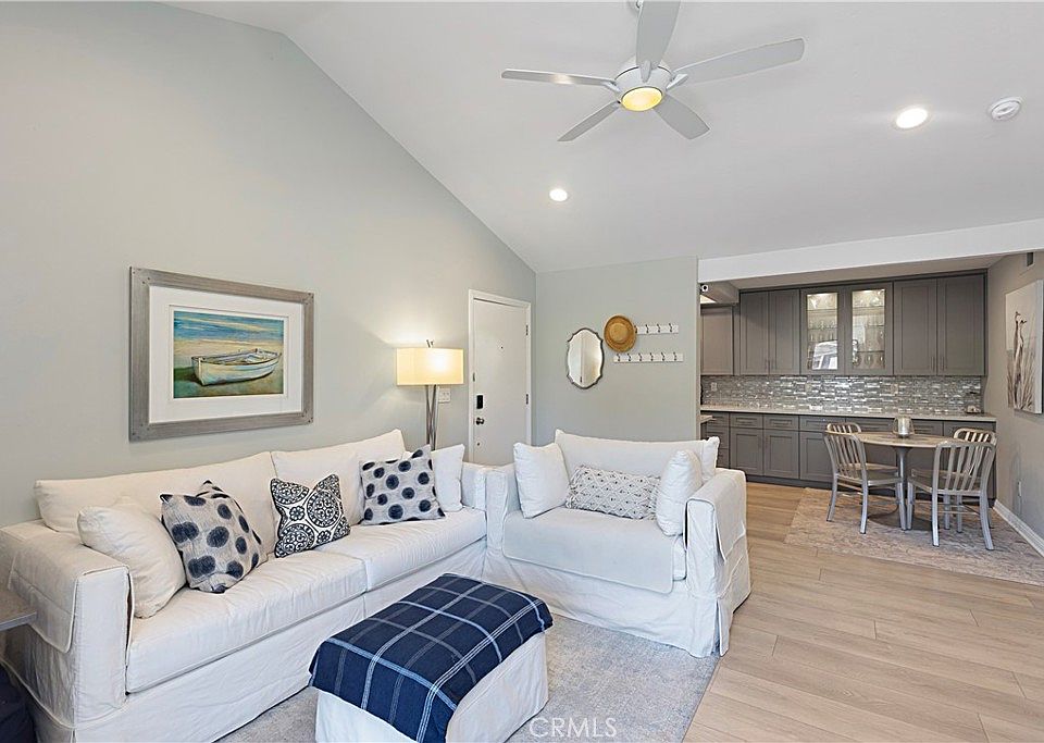 Presenting a stunning and completely remodeled condo situated in the resort-style Dana Point community of Harbor Creek. Renowned for its proximity to world-class Southern California beaches, biking trails, restaurants, shopping, and easy access to the 5 freeway. This recently renovated one-bedroom, one-bath condo-home is just a stone's throw away from the sandy shores of Doheny Beach. This hidden gem combines charm, a prime location, affordability, to make it one of Dana Point's best-kept secrets. Immerse yourself in the tranquility of this beautiful community, characterized by picturesque landscaping, serene streams, and enchanting walkways—a coastal haven with a touch of mountain resort ambiance. The condo itself boasts a thoughtfully designed open floor plan, lots of storage space, vaulted ceiling in the living room, and a double-door entry to the primary bedroom. The tastefully updated chef's kitchen was built to impress with its gorgeous modern soft-close grey cabinetry, custom tile backsplash and Cambria Quartz countertops that extend into the dining area. Also featured are newer stainless-steel appliances, many pull-out drawers that maximize storage space and several special cabinets with lighting to showcase your finest china and dinnerware. Stylish accents include upgraded cabinet hardware, modern bathroom fixtures and gorgeous neutral colored vinyl flooring throughout. Laundry area closet is conveniently located on the balcony where extra storage shelves has been added to organize all of your belongings. Private balcony is a wonderful place to savor your morning coffee before a beach day, a refreshing dip in the pool, or a relaxing soak in the spa. Enjoy private gate access to the San Juan Creek trail for walks or bike rides leading directly to Doheny Beach. Well-managed HOA covers water and trash expenses, and the entire complex has been repiped. Your condo comes with a conveniently located assigned covered carport and ample guest parking. Pet-friendly complex offers designated doggie walk areas, though there's a 30 lb. pet weight limit. Invest in Dana Point, experiencing ongoing revitalization with its picturesque harbor and trendy Lantern District. Engage in various activities, from whale watching, to surfing and paddle boarding. Seize the opportunity to own a piece of coastal living in Dana Point before the harbor's complete renovation. If you thought resort-inspired coastal living was out of reach, think again-your slice of paradise awaits!!