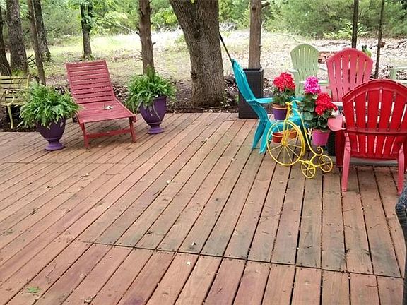 Adorable and secluded - Very wooded lot with two story wood sided home! This property features 4.99 acres MOL with a nice deck wrapping around the home and a HUGE enclosed porch, a 24X20 detached garage, storm shelter and storage building. This is a must see!