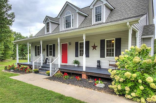 Rolling, private 5 acre lot minutes from Lake Anna and Hanover line. This beautiful Cape Cod has a fantastic layout with a large kitchen, dining room, family room with gas fireplace, laundry room and master bedroom all downstairs. Master bedroom has walk-in closet and Master bathroom has a jetted tub with great views! Second floor has 3 spacious bedrooms and nice full bath. House has been freshly painted, ceiling fans throughout and attached two car garage. New hot water heater, new dishwasher and new microwave. Large detached storage shed and Sunsetter retractable awning on back deck! Large front porch (6 x 42') has been freshly stained. You must see this great house and property!