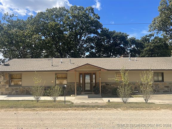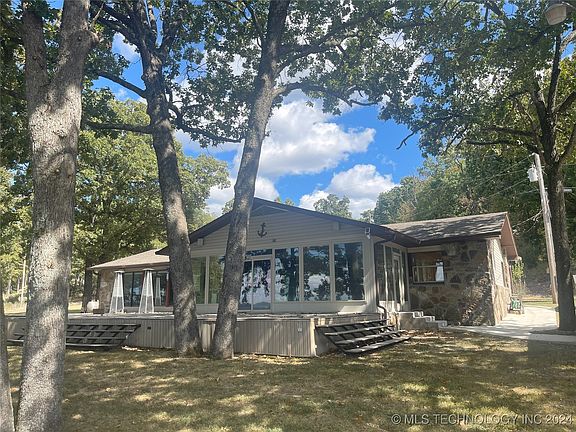 Experience the Ultimate in Lakefront Living with A ROOM WITH A VIEW! Prepare to be captivated the moment you enter this single-story home, perfectly situated on a sprawling 0.55-acre lot m/l with breathtaking panoramic views of Grand Lake. This residence is designed for both relaxation and functionality, featuring three bedrooms, including two with private baths, a guest bathroom, and a versatile flex room adjacent to the primary bedroom. The granite kitchen is complemented by a cozy fireplace in the living area and a FABULOUS Lake Room, ideal for enjoying panoramic views and unforgettable sunsets. Outdoor enthusiasts will appreciate the expansive deck, ideal for entertaining, as well as the covered dock with two boat slips and a PWC lift. The detached oversized garage, complete with a workspace and a covered porch, adds to the property's appeal. Whether you're seeking a full-time residence or a weekend retreat, this partially furnished home offers the best of both worlds. Don't miss the opportunity to own this exceptional Lakefront property, perfect for summer fun and stunning fall views. With comfort, natural beauty, and incredible views, what's not to love?