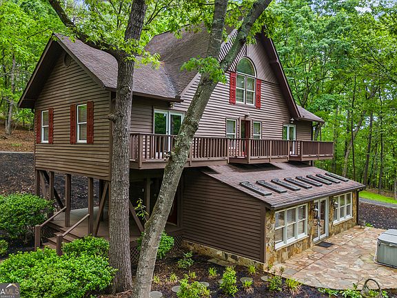 Adirondack-Style Lodge on 5 private acres. Bordering 2,000+ acres of Chattahoochee National Forest. Tucked away in the heart of the Northeast Georgia Mountains, this stunning lodge-style home offers the perfect blend of rustic charm and modern comfort. This property is a dream come true for outdoor enthusiasts, hunters, and anglers alike. Step inside to a sunken living room featuring natural stone floors, abundant skylights, and a warm, inviting atmosphere-ideal for relaxing after a day spent exploring the great outdoors. 4 bedrooms and 3 full baths ensure plenty of space for you and your guests. Enjoy your morning coffee out on the master bedroom balcony. Outside, a detached two-car garage with a large loft and power, affords the ability for a home gym or game room flex space. Two additional storage buildings provide ample space for gear, tools, and recreational equipment. Whether you're storing hunting supplies, fishing gear, or mountain bikes, this property is built to support your lifestyle. Though it feels secluded and serene, the property is conveniently close to shopping, dining, medical facilities, and entertainment, offering the best of both worlds. This is more than a home, it's your gateway to year-round adventure in one of North Georgia's most scenic and wildlife-rich regions. Don't miss this rare opportunity to own a piece of wilderness paradise with direct access to nature's playground.