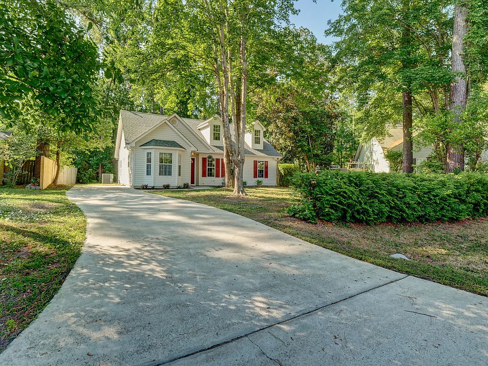 Don't miss this lovely 1.5 story home in an ideal spot on a cul-de-sac lot with private backyard. Open and spacious are what come to mind as you enter your home with the cathedral ceiling, bay area, and French doors that bring the outside in. The light, large kitchen with island, tile floors and ample counter space are ideal for the most ambitious cook. Beautiful hardwood floors in the common areas and master bedroom, new paint, new carpet, new roof make this a move-in ready home. Choose where you want to relax: the sunroom with windows on three sides, overlooking the wooded backyard; or the bonus room with dormers and window seats, ideal for streaming your favorite movies or curling up with a book. Storage? Not a problem with walk-in attic, and 12x12 shed with partially floored ceiling rafters. Close to shopping, the beach, and Myrtle Grove Middle School. In fact, it's just a short trip over a wooden bridge to the school. No HOA dues or city taxes.