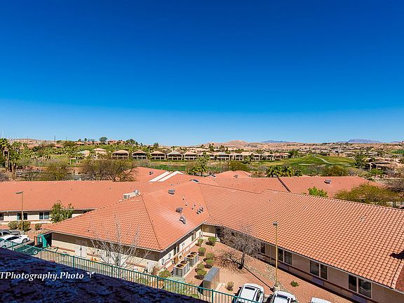 The location of this immaculate Falls Hillside Condo is ideal. Enjoy panoramic views of the mountains and green distant fairways of the Oasis golf course. This condo is located in a quiet location at the end of Colleen Court. This upper level condo offers, privacy, simplicity and convenience. The home is trimmed with coffered ceilings and is painted in neutral color to compliment any decor. The dining area is situated in the front of unit with beautiful views. This unit has 2 bedrooms and 2 full bathrooms, window coverings, ceiling fans and plenty of closet space. Easy access to the washer and dryer located right off the kitchen area. Chrome fixtures accent both the master and second bath. The master bath welcomes you to a large walk in shower area and has a sink with vanity area to allow for plenty of counter space. Located north of I-15, this beautifully maintained community has a tropical setting and a community swimming pool. The low all inclusive HOA fee allows free access to the Master Community fitness facility, pool and spa. If you are looking for a view in a nice quiet location, this condo is for you.
