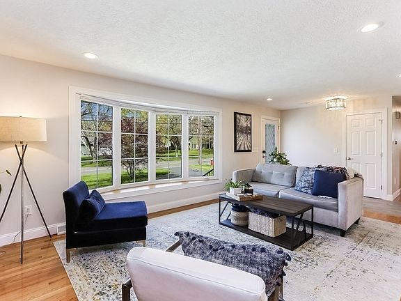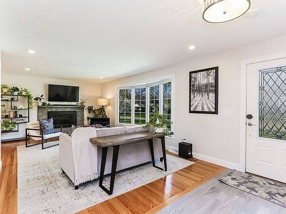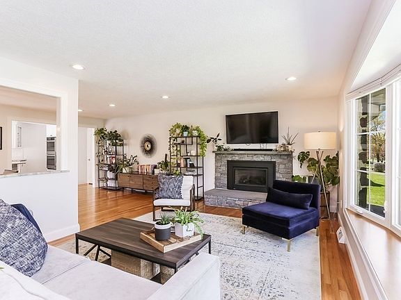 EXTENSIVELY RENOVATED executive ranch highlights fabulous open plan, circular flow, loads of natural light through newer windows, gleaming hardwoods & inviting interiors in Blueberry Hill district. Generous living room featuring bow window & gas fireplace w/stone surround & hearth opens to dining room & renovated kitchen beyond. Impressive kitchen highlights white wood cabinetry, leathered granite tops, tiled backsplash, stainless appliances like gas range & wall ovens, large center island w/seating, deep pantry closet & slider leading to patio & large, fenced-in backyard w/storage shed. Bedroom wing showcases primary suite w/walk-in closet & renovated bath w/shower, 2 additional bedrooms w/hardwoods & double closets plus large full bath w/tile flooring, double vanity & tiled tub/shower. Renovated lower level is perfect spot for recreation w/tile flooring, ¾ bath, laundry room w/sliding barn door & storage. Prime location near Turner Park & town center w/its shopping & restaurants.
