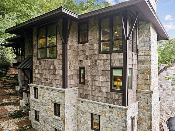 Newly Reduced Price! You will not find another home like this exquisite custom built European tower residence in prestigious Highlands Country Club. Established in 2015, this home perfectly bridges the outdoor space of the beautiful mountains and natural elements with the interior. Arriving at this property, you will drive under a remarkable stone tunnel to reach a huge parking court. Upon entering, there is a four stop elevator for easy access to all floors. The top of the tower features the main open concept living space with a 360 degree panoramic view. The main floor features the primary bedroom and a secondary bedroom; the entry level floor is equipped with two more bedrooms. The terrace level has a secondary living space, wine cellar, wet bar, and half bath. Outside there is a covered pavilion with a fireplace and TV complete with surround sound. Above the garage is extra flex space. Features of this incredible property include all Marvin windows and doors, Isokern fireplaces, charming gas lanterns, a surround sound system on the upper level and pavilion, all Kohler fixtures, foam Insulation, four HVAC units, two water heaters with recirculation pumps, and a 50 year faux slate roof. The kitchen features marble counters, two dishwasher drawers, a Sub Zero fridge, Wolf Range, and a wet bar. There is a fantastic all seasons sunroom off the kitchen with a charming bridge outside that takes you to another entertaining space. There is textured design throughout the home including wood accents and moldings, walls, ceilings, tile, marble, locally milled stone, and various kinds of beautiful woods. This home is being sold fully furnished with elegant furniture and decor. There is also a third utility garage for a golf cart or utility vehicle, a whole house generator, and TONS of storage! Hotwire Internet connection and excellent service!