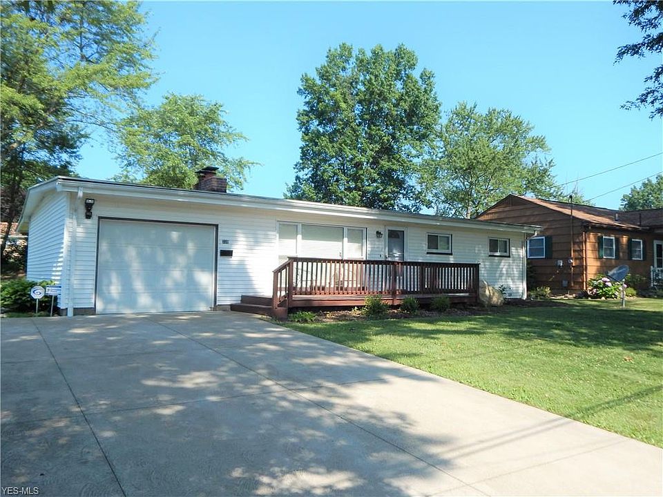 Nice Ranch home on charming lot with hardwood floors, two fireplaces, updated Bath, vaulted ceilings in Living Room, Dining area, Kitchen and Bedrooms. Updated vinyl windows, extra deep Garage, covered back Porch, Deck and new pine trees for added privacy. Partially finished Rec Room and more! So conveniently located close to everything in town!