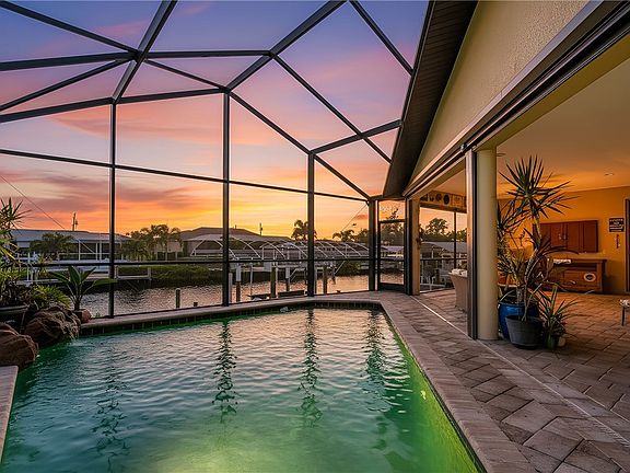 NO HURRICANE OR WATER DAMAGE! PRIVATE BOAT DOCK WITH LIFT. NO HOA, 4 MINUTES TO I75. Attention Waterfront & Boating Enthusiasts! Instant Boating Access. Imagine living just 30 seconds from the open waters of Charlotte Harbor, with seamless access to the Gulf of America. This gem is a 2015-built, 3-bedroom, 2-bathroom home with a pool, spa, and a spacious 2.5-car garage. Designed with 2,000 sq. ft. of elegance, it’s the perfect blend of luxury and functionality for waterfront living. The property features a PRIVATE BOAT DOCK with a 7,000 lb. covered boat lift and an 80' concrete seawall. A 574 sq. ft. covered lanai with stone pavers creates an outdoor paradise, perfect for entertaining or relaxing while enjoying breathtaking canal and pool views. The 2022 ROOF provides peace of mind, and the double-wide driveway includes extra parking space with room for an RV. Inside, the home’s open, split floor plan is bright and airy with premium upgrades throughout. PGT impact glass windows and zero-edge sliders open completely to the lanai, seamlessly connecting indoor and outdoor living spaces. The great room features 9' tray ceilings, stylish plank tile flooring, and recessed LED lighting, while the chef’s kitchen boasts a granite island with a built-in sink, wood cabinetry with crown molding, stainless steel appliances, a wine bar, and a decorative tiled backsplash. The spacious primary suite offers pool views and a luxurious en-suite bath with dual sinks, granite countertops, and a Roman walk-in shower. The two guest rooms include one currently serving as a custom office with molding accents, and another with a large closet and direct access to the stylish guest bathroom featuring subway tile, a ceramic vessel sink, and pool access. Added upgrades include BRAND NEW $20,000 ELECTRIC HURRICANE SHUTTERS and a NEW POOL PUMP, offering additional value and storm protection. Additional features include an oversized 675 sq. ft. garage with two custom storage rooms, a generator plug, and a 220 OUTLET. Pool enhancements include upgraded screening, a sun shelf, and a pool equipment closet on the lanai. The professionally landscaped yard features colorful rock trim, palms, and shrubs, completing this picturesque setting. Picture yourself sipping morning coffee on the lanai, watching boats glide along the canal, or heading out for an afternoon cruise to the Gulf. This home is perfectly designed for relaxation, entertaining, and fully immersing yourself in the Florida waterfront lifestyle. This property offers even more than just stunning waterfront features. Enjoy a golf cart-friendly neighborhood complete with a park, lighted tennis/pickleball courts, basketball courts, BBQ areas, sheltered picnic spots, and a convenient boat ramp. Easy access to Punta Gorda airport, shopping, dining, downtown historic Punta Gorda, and the luxurious Sunseeker Resort. Bridge Clearance for Up to a 44ft Sailboat. Schedule your viewing today and step into your dream Florida lifestyle!