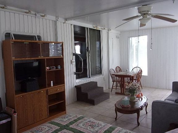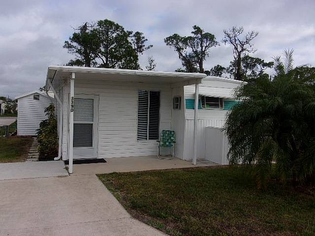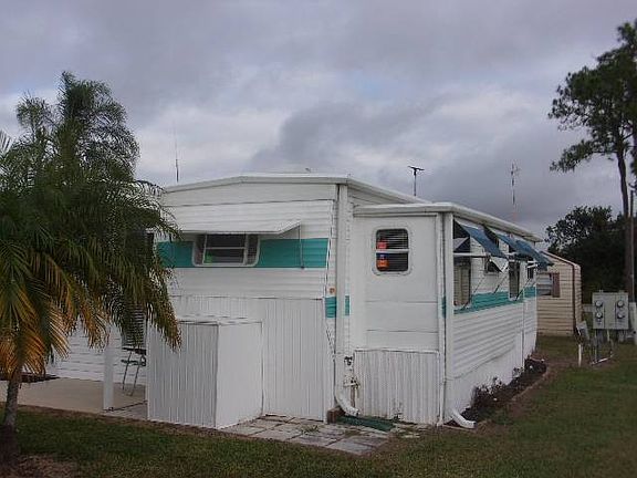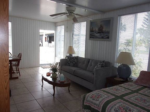 Located on leased land in a 55+ community. Reduced! Furnished 1 Bedroom 1 Bath home with Tiled Florida Room with 2018 Wall A/C and an extra bed and two exterior doors. In the main part of the home there is central A/C. The kitchen comes with a newer refrigerator and wood laminate floors throughout. Bath has an easy step-in shower. Two patios; one on the back and one on the front with an outside storage shed. Great "snowbird" home!