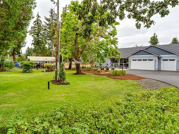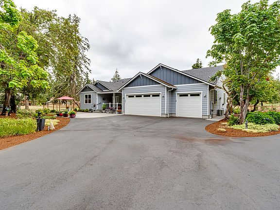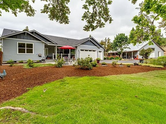 Stunning, spacious home with all the bells and whistles including land! This Gorgeous home boast of large open kitchen, dining, eating area and living room. The kitchen comes equipped with an additional eat in bar, double ovens, built-in microwave, granite and quarts countertops, pantry and stainless-steel gas appliances. Livingroom and eating area has sliders to the back deck with additional patio and covered BBQ area. This home has great division of space with primary ensuite on one side, with jetted tub, walk-in shower, walk-in closet and exterior door to back patio. The additional 2 bedrooms are located on the other side of the home with an additional bathroom. This house also has an adequate office space with a half bathroom across the hall. The exterior of the home offers raised beds, apple and plum trees, mature landscaping, fenced yard and large barn that has been converted to shops and storage. This space could be restored to a barn with hay loft and stalls if needed for farm animals. This home is also equipped with extras including additional filtration for the HVAC, inground sprinklers in the back yard and a Generac generator that powers the entire home automatically if there is a power outage. Plenty of room for family or entertaining guests. Bring your RV and your toys, there is covered parking and a 3-car garage! Come sit on the cozy covered front porch and enjoy nature, just minutes from Historic Cottage Grove.