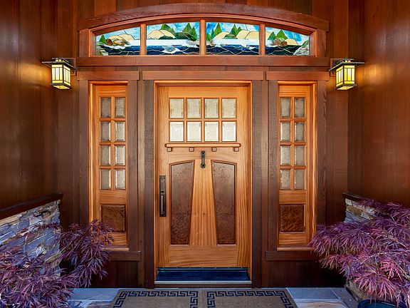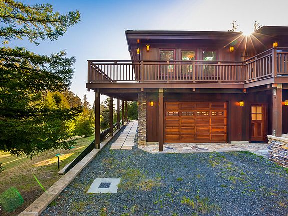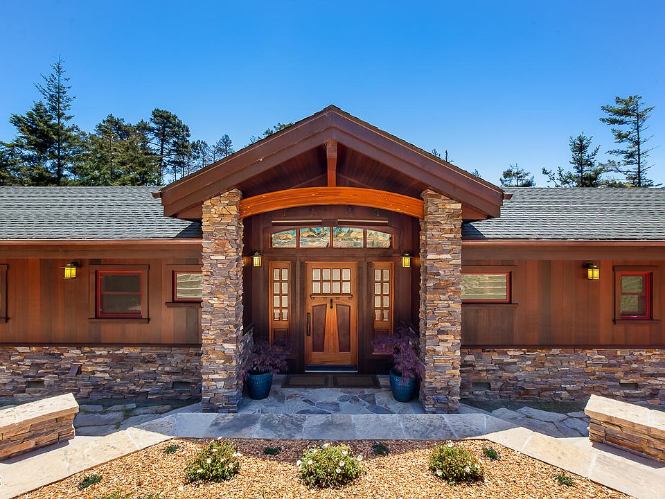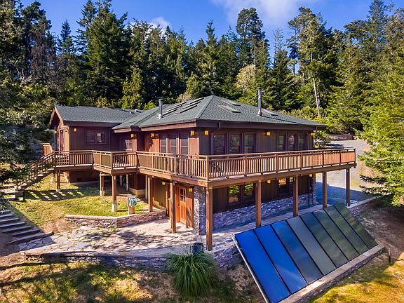 Exquisite craftsmanship throughout this artful masterpiece of a home. From the handmade curly redwood and mahogany entry to the custom stained glass local landscape over the foyer, every detail was painstakingly created with an uncommon level of perfectionism. The center of the home is a light filled spacious living area that opens up under massive curved beams. This great room seems to float above the meadow below, with classic Mendocino coast scenery unfolding out every window. Fifteen skylights and abundant windows create an airy feeling to balance the home's substantial wood and stone elements. Two private bedroom wings offer peace and tranquility. An additional bathroom is placed conveniently on the lower level where the full garage, systems and storage areas of the home are located.