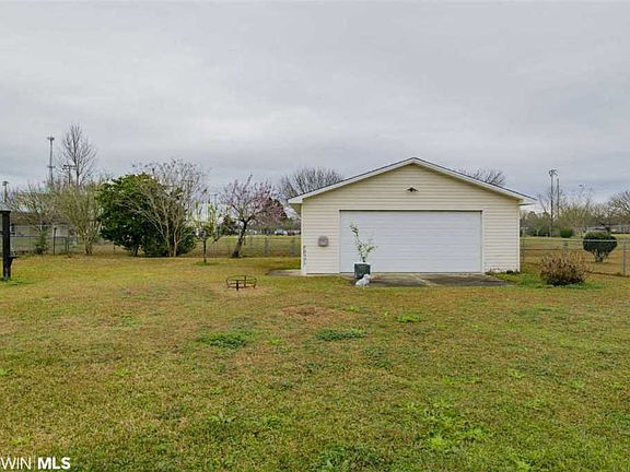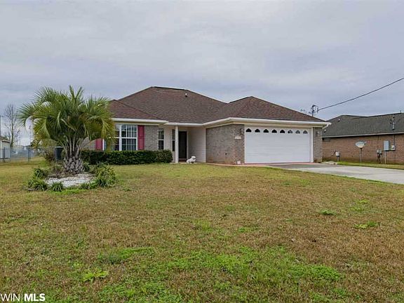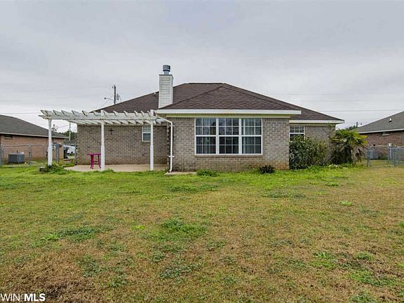 One story brick home in Lillian. House features an extra 2 car garage for total of four spaces; bring your boat or car collection! Enjoy fenced backyard with fruit trees, heated and cooled sunroom with French doors, a pergola covered patio, and covered entry. Kitchen w/ breakfast area features wood look laminate flooring and opens to great room w/fireplace and vaulted ceiling; Split floorplan. Master features trey ceiling, dual sinks, low entry shower, and walk-in closet. Bay windows accent the breakfast room and guest Bedroom. Quiet neighborhood close to FL & AL beaches, 10 miles from Pensacola NAS, and less than 1 mile from public boat launch. Home includes blinds and refrigerator. This home qualifies for Special Financing.