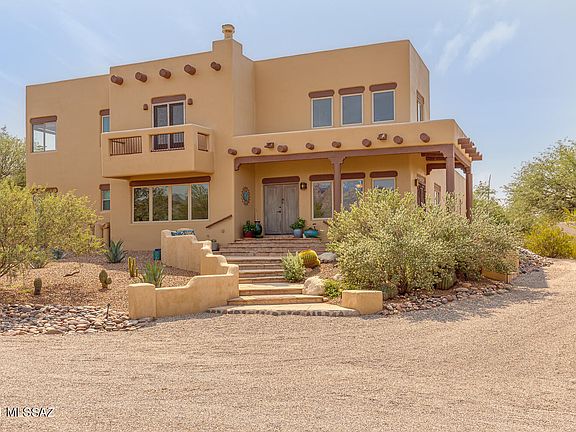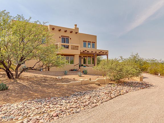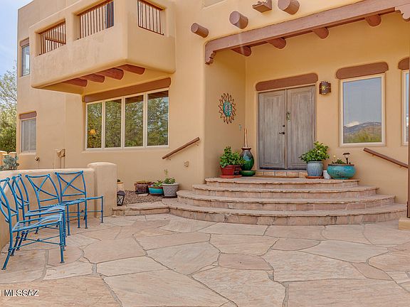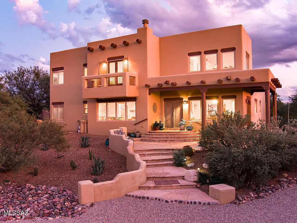 Truly one-of-a-kind Ray Birch custom Santa-Fe home nestled on 4.1 dividable acres with picturesque mountain views! This gated oasis is quiet and serene, despite being only minutes from city life, you will feel as though you are in another time and place. Boasting rooms for all your guests with two master suites downstairs, and an upstairs master ''wing'' with sitting area, fireplace and breathtaking views! The upstairs is complete w/a corner room, perfect for an office or workout room with panoramic mountain skies! SW Charm and character exude from the exposed Vega beams, vaulted fireplace, tile work, & a two-story water feature that travels along the staircase. Grab a drink from your wet bar and head out to the intimate & lush enclosed backyard, providing the perfect resort