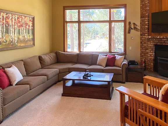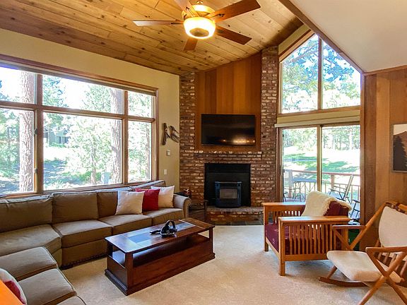 Premier location on the corner of the Woodlands project next to the 12th green of Sierra Star golf. Southern views of the Sherwins and look up the fairway to Mammoth Mountain. Sold fully furnished and ready to enjoy and/or do nightly rentals—fantastic hassle free opportunity to begin your Mammoth experience! Beautifully remodeled kitchen and baths. Tasteful furniture and decor throughout. Flat panel TVs all in place. Pellet burning stove in fireplace. Vaulted ceiling, natural wood paneling, solid wood doors and wood encasement windows. Stack washer/dryer. Lockable owner storage under stairs. Sun, views and natural trees. Immediate access to the Red Line shuttle—downtown, Village and Main Lodge, etc. HOA has a nice pool and spa area.New roofs. Check out the video tour.