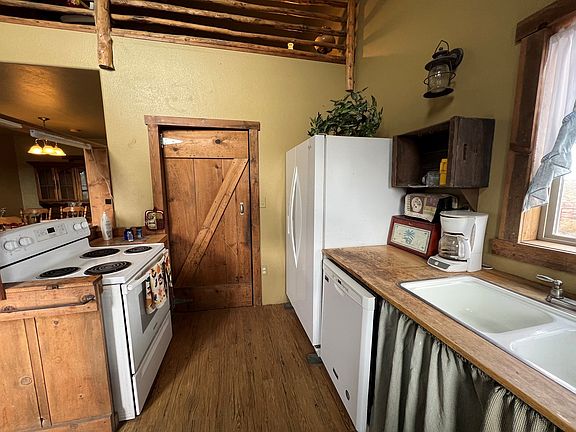 KITCHEN: Located off the living room areas; wood countertop, dual farm sink, laminate wood flooring, and large pantry space with washer/dryer hookups and built-in shelving/pot/pan storage rack; custom barn door into pantry