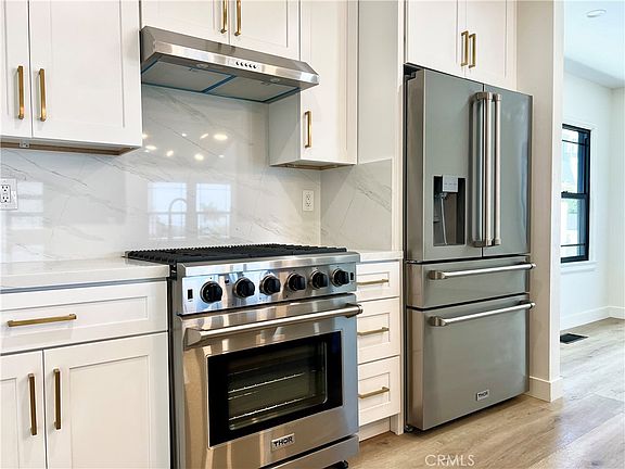 fireplace, and newly remodeled kitchen with large island. Kitchen features oak colored shaker cabinets, quartz countertops, tile backsplash, and stainless steel appliances. Beautiful black frame windows, french doors and a new front door all grace the front unit living room, adding modern elegance to this delightful home. Current owners reconfigured the home to create a new added bathroom as well as walk in closet to the home. Back unit is in rear up a flight of stairs over 2 car garage with a minimal common wall! It is a one bedroom/one bath with city lights and