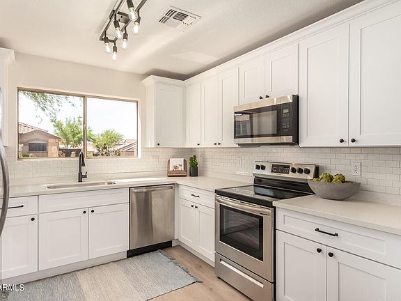 This gorgeous home has been completely remodeled with quality finishes! Open floor plan has fabulous kitchen featuring new custom white shaker cabinets with soft close doors/drawers & quartz countertops! New luxury vinyl plank wood floors throughout! New appliances! New wood blinds! New interior/exterior paint! New lighting/fans! New plumbing! Fully remodeled master bath w/ tile surround walk in shower! Private, low maintenance backyard has covered patio & artificial turf! The location of this home is the best in the neighborhood! Corner lot, with no backyard or west side neighbors! Right next to community pool, greenbelt & large parking lot for your guests to park! Close to the 60 freeway, shopping, restaurants & multiple golf courses! Views of the superstition mountains!