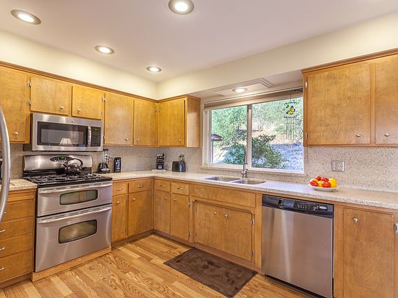 Panoramic mountain views await you at this updated 3 bed, 2 bath home sitting on 2 1/2 acres just outside of the Placerville city limits. This beautiful home showcases an open floor plan with large dual pane windows throughout, bringing in bounds of natural light. Upon entering, you will notice the new carpet and recent laminate flooring, recess lighting, ceiling fans, and newer, efficient pellet stove in the great room. From the great room, you will enter the updated kitchen, which includes stainless steel appliances. Relax after a long day on your private patio with spectacular views of the Central Valley and Mt. Diablo. This home is set up and fenced for horses with workshop, shed, and hay barn. Truly one of a kind!