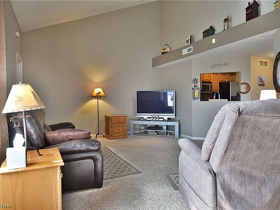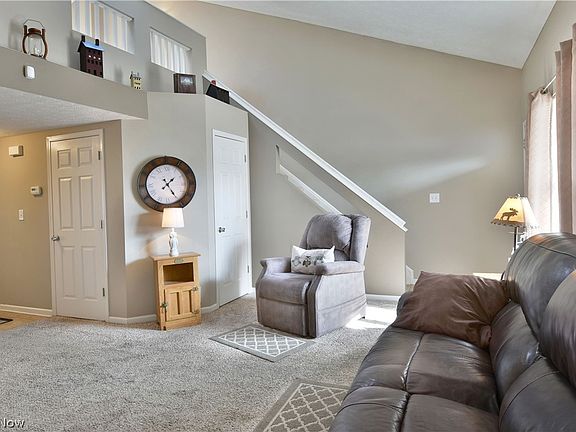 Start your next journey with this wonderful Cortland condo, delighting with two floors of finished living space within its two plus bedroom layout. The residence, located in a desirable development putting you close to local shopping and dining districts along with a scenic lakeside metro park. The newer unit offers a personal driveway with an attached two car garage while a concrete pathway lends to the bold, red front entry door. Inside, a posh living room is carpet lined to include the rising stairway. The soothing, natural color scheme is offset by white trim work as tall ceilings tower overhead to include a large skylight. A serving window peers through towards the ample kitchen as you make your way down the hall, past first floor laundry services and utility access. The kitchen is dressed in elegant tile work while jade colored counters run between the warm cabinetry and stainless appliances. Formal dining extends out to a rear patio as sliding doors grace the far wall. A sizeabl