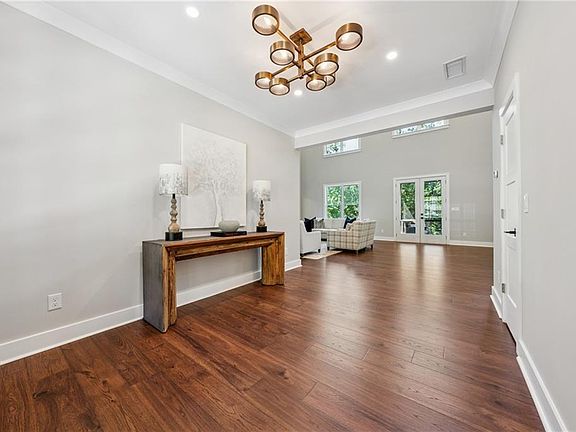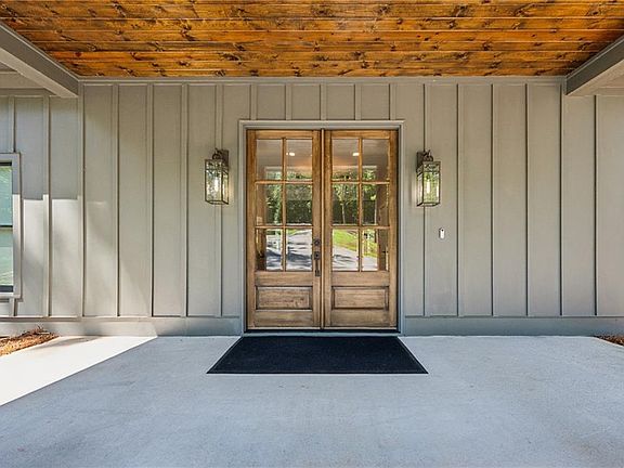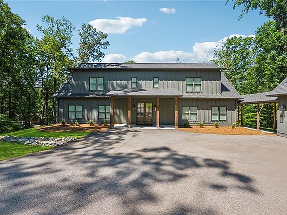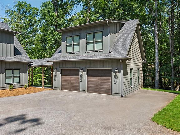 Welcome to this stunning modern decorator’s custom home, perfectly situated on 4.5 acres with 338 feet of frontage on USCOE property and a private covered, single-slip dock in place. This thoughtfully designed, newer constructed 3-bedroom, 3.5-bath residence offers high-end finishes, luxurious features, and timeless style throughout. A welcoming foyer opens into an impressive two-story great room with an elevated gas/electric fireplace, seamlessly flowing into the dining area and a gourmet kitchen. The kitchen is a chef’s dream, boasting Viking appliances—including a 36” gas range—custom cabinetry with drawer pullouts, quartz countertops and island, and built-in wine cooler. The main-level primary suite is a true retreat, featuring vaulted ceilings, a bold statement wall, custom window treatments, and an exquisite ensuite bath with double vanities, a stand-alone soaking tub, and oversized glass shower. A spacious, ready-to-customize walk-in closet completes the suite. Also on the main level, you’ll find a stylish half bath, a coat closet, a fully equipped laundry room with soapstone work surfaces, pantry, built-in cabinetry, and a sink. Just off kitchen is a versatile flex room with leathered quartz counters—ideal as a home office, bar, or scullery. A screened porch at the rear of the home overlooks a peaceful, private backyard with a perfect area for future swimming pool, accented by hardwood trees and bordered by a spring-fed creek. A hidden rear staircase leads upstairs to a catwalk with views of the great room below and two additional bedrooms, each with its own private bathroom. Two large unfinished storage areas on the second level offer ample additional storage. The property also includes a detached two-car garage connected to the home via a covered breezeway, with a large unfinished bonus room above that’s perfect for future guest quarters or a studio. A separate paved driveway provides extra parking or space for an RV. Outdoor living is enhanced by a 6-zone irrigation system that covers the front and back yards, and large garden area. Additional features of home include luxury Revwood Luxury flooring, designer lighting, custom bathroom tile, a zoned HVAC system, tankless gas water heater, and AT&T Fiber availability. The home is handicap accessible on the main level with stepless entry and wide doorways in key areas. With no HOA fees and only light covenants, this exceptional property offers the rare combination of custom luxury, modern functionality, and peaceful lakeside living. Don’t miss this opportunity to own one of the most distinctive homes in the area, within walking distance of Lake Lanier’s Robinson Park and Boat Ramp.
