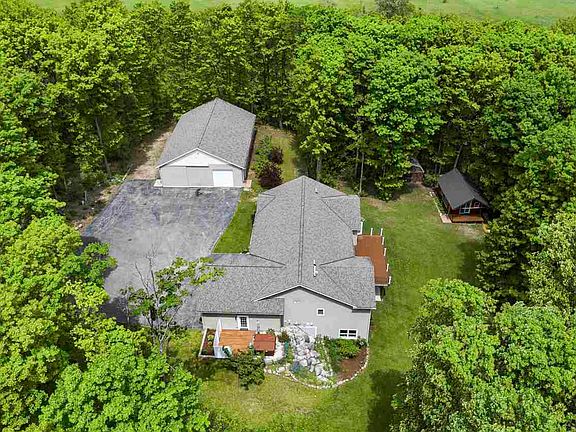 Perfectly set on over 5 acres of wooded land, this newer ranch style home offers peaceful Northern Michigan country living while still being minutes away from Petoskey's shops and restaurants. A hard to find combination of acreage with a creek, a large pole barn, additional outbuildings, and newer construction just several miles out of town. The thoughtful open floorpan with main floor bedrooms, new trex deck, and large basement, recreation, and family rooms are perfect for entertaining family and friends. Head out into the lush backyard from the lower level walkout and sit by the fire with some s'mores or head up to the hot tub for a nice relaxing soak. ICF construction with in-floor heat and additional exterior wood boiler are extremely energy efficient. You won't run out of storage with a 60 x 40 pole building, which is partially heated, and an additional shed. The new rustic cabin adds a great touch for card games or relaxing during summer evenings with the screens in. The seller's care and attention to detail can be seen throughout the home with the beautiful wood floors, elegant finishes, and functional design. The 16 x 20 cabin with a 6' covered porch is made almost completely out of locally sourced recycled materials and would make the perfect guest house or place to entertain. Store boats, cars, or any other toy your can dream of in the 2,400' pole barn that also includes a 20 x 30 heated workshop.