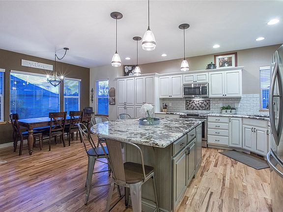 Welcome to this beautifully designed custom home full of exquisite upgrades and finishes throughout. Situated on a large corner lot this stunner is surrounded by lakes, trails, parks, and open spaces, and centrally located near schools, shopping, dining, and entertainment. Features include a spacious open floor plan, high ceilings, gourmet kitchen with huge island and upgraded stainless steel appliances, gorgeous granite counter tops, wood floors, large patio with pergola perfect for entertaining, luxurious master suite, over sized 4 car garage with 11 ft ceilings and built-in cabinets, 2 gas fireplaces, covered front porch, main level office with French doors, brand new carpet, full finished basement with custom wet bar, and much more!