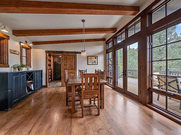 Nestled on 3.5 acres off a quiet road, this magnificent mountain retreat boasts desirable main-level living. Peace and serenity abound while capturing beautiful mountain valley views off the back deck and snowcaps of Mount Evans from the Primary Suite. The gorgeous home enjoys an open concept floor plan with a towering stone fireplace, wood beam accents, walls of windows facing the views, cathedral vaulted ceilings, and many other custom upgrades and finishes throughout. The beautiful kitchen has upgraded Kitchen-Aide appliances, knotty alder cabinetry, polished and leathered slab granite and a large working island with breakfast seating. The main level primary suite has a large walk-in closet, a five-piece bath with shower and luxurious soaking tub and a private deck to enjoy those views. The large deck can be accessed through the dining room or living room, and is steeped in sunlight; the sunsets are amazing! Don’t miss the 450+ square foot bonus room above the garage that is currently set up as a gym or the open loft above the great room; either may make an ideal home office. Enjoy the great outdoors from the extensive stone patio with a gas firepit and pond water feature. The 3.5-acre property provides privacy and gentle terrain around the house to park extra vehicles, a boat, and an RV, and the chicken coop out front can be filled with new feathered friends. Located only 10 minutes to downtown Evergreen, Evergreen Lake and Golf Course. This incredible property is a must-see mountain retreat offering a quintessential Colorado lifestyle, Call today for your private showing.
