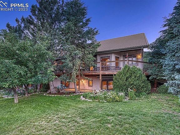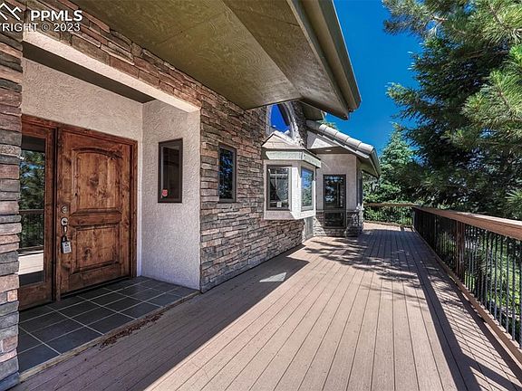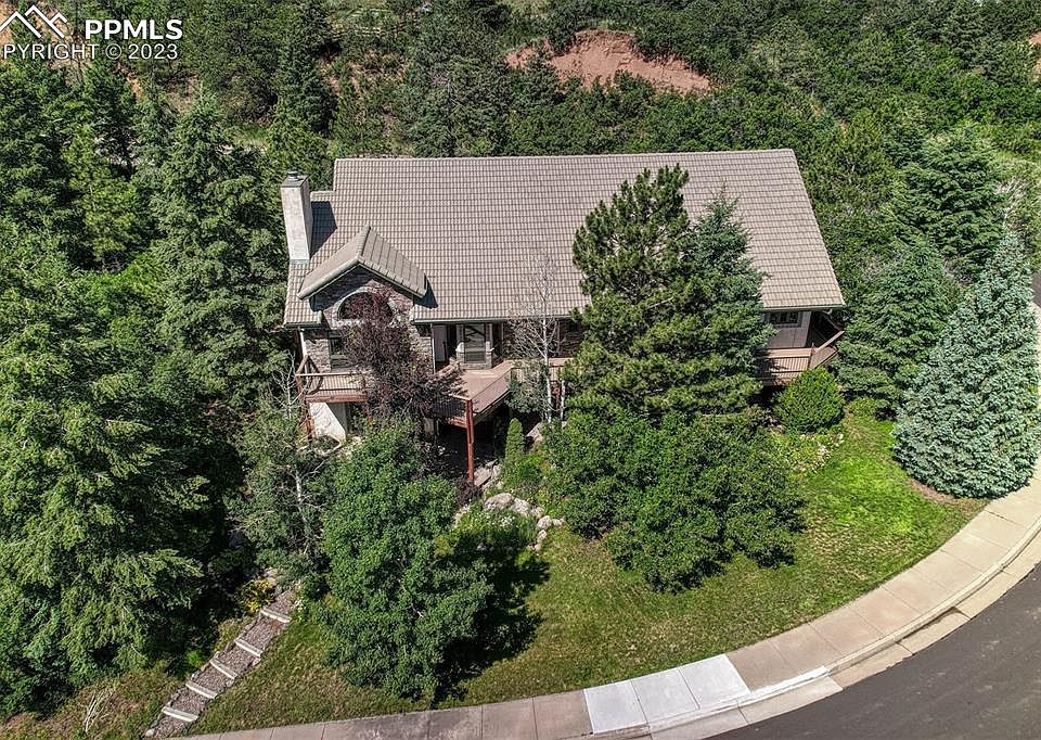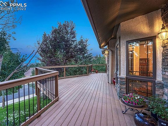 Exceptional Top of Skyway custom-built walkout rancher backs to Gold Camp Rd on .40-acre corner lot. The wrap-around composite decks provide 360 degree views of the city lights, Garden of the Gods, & Cheyenne Mtn! Well designed floor plan with great attention to detail. Enjoy the bright & open floor plan w/generous indoor/outdoor living spaces, great for entertaining. Beautiful Alder wood doors, vaulted & high ceilings, hand troweled walls & walnut wood floors are found throughout much of the ML. Kolbe wood windows. ML central air and wired for sound system. Radiant heat throughout. The slate-tiled entry opens to the formal DR & LR w/wood burning raised hearth, tile surround FP. Powder bath off the entry. The island kitchen offers custom cabinets w/distressed Old World finish & elegant lapis blue Avonite countertops. The kitchen boasts a planning desk, a bakery closet w/built-ins, & walk-in pantry. Appl include an electric range, dishwasher, double ovens, built-in microwave & side by side refrigerator. The Family Room and Bay Nook off the kitchen walk out to the front deck - a great place to enjoy the view with your morning coffee. The ML owner’s suite enjoys its own private deck, 5pc Bathroom & walk-in closet. The laundry/mud room has built-in cabinets & utility sink. The oversized garage has 2 service doors. Iron railings lead you down to a huge walkout 9ft Bsmt w/ 2nd powder bath & storage. The expansive Bsmt Fam Rm walks out to a back patio & can serve as a theater area, gaming area, etc. It has a separate Flex Area for a gym, craft room, office or can easily be converted to BR4. The bsmt Powder Bath has adjacent plumbing to expand the Powder Bath to a full bath. There are 2 more bsmt BRs w/ensuite Baths. Outdoors balances the natural landscape with master gardener’s touch w/spring-fall blooming plants, raised beds, lush shrubs & mature trees. Durable concrete tile roof. Ideal location close to highly rated D12 schools, parks, trails, & downtown Col Spgs.