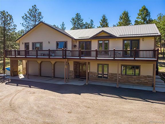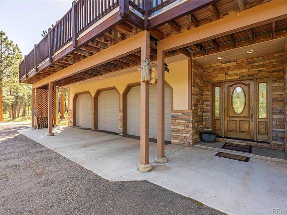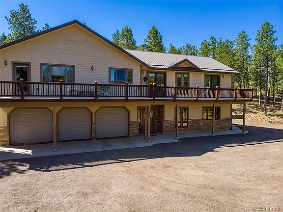 Step into mountain livings beauty and grace in this distinctive home. Upon entering the home one is greeted by the large foyer. To the immediate left rests a 5-car tandem garage covering 1,722 Sqft. containing storage shelving, utility sink, large work bench, EV charging outlet, and a floor safe. Within the garage is the utility room outfitted w/2 furnaces, 2 water heaters, and a 300 gallon water holding tank. A portion of the basement is finished with a ¾ bath and direct access to the remaining unfinished basement. Perfect for those with individualized development in mind. Beyond the endless possibilities that lay within the basement, the central staircase within the foyer guides you to a magnificent living floor plan w/ soaring ceilings, complete with a Great room including a woodstove for our Colorado winter days and large view windows. The lustrous kitchen boasts its granite counter-tops, hickory cabinets with ample storage space, prep-sink, room for bar stools and stainless appliances with direct access to the dining area making it great for entertainment. Just off the kitchen you will find a 66” hallway leading to the double door entry into the primary bedroom with a walk-in closet, jetted jacuzzi tub, roll-in/walk-in shower, double sink with vanity, the ambiance of a gas fireplace and access to the front deck to take in the serenity and wildlife. Down the 46” hallway lies the main level laundry room, 1st spare bedroom w/ a private full bath, and the 2nd spare bedroom with a private ¾ bath. Located on a vast park-like useable setting of 4.15 acres, this home is outfitted for the needs of many. For future renovation purposes, the property is pre-equipped with a 4-Bedroom septic system; RV parking and RV dumping capabilities. With wheelchair accessibility in mind, an outdoor HARMAR Vertical Platform Lift provides easy access to the Trex deck. All this conveniently located near hiking & biking trails, fishing, and easy access to HWY 285 for commuting to Denver!