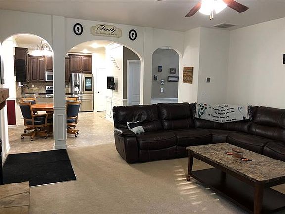 4 BR, 2.5 BA on nearly a half acre lot with wooded privacy at end of cul-de-sac. 2 story foyer with extended hallway boasts judges paneling and leads into an open floor plan. Spacious living room features wood burning fireplace with stone surround and wood mantle. Kitchen offers granite counters, tile backsplash, breakfast bar, stainless steel appliances, 42 inch cabinets and recessed lighting. Breakfast area has bay window overlooking back yard. Formal dining room also features bay window overlooking front yard, coffered ceiling, judges paneling and hardwood flooring. Huge owner suite provides additional sitting area or office space and walk-in closet. Owner bath provides double vanity, separate shower and garden soaking tub with tile surround. Detailed crown molding, beautiful archways, double paneled doors and 2 inch blinds are throughout the home. Covered and uncovered back patio. Privacy fenced rear yard. Lot goes past fence line. Seller offering 1 Year 2-10 Home Warranty.