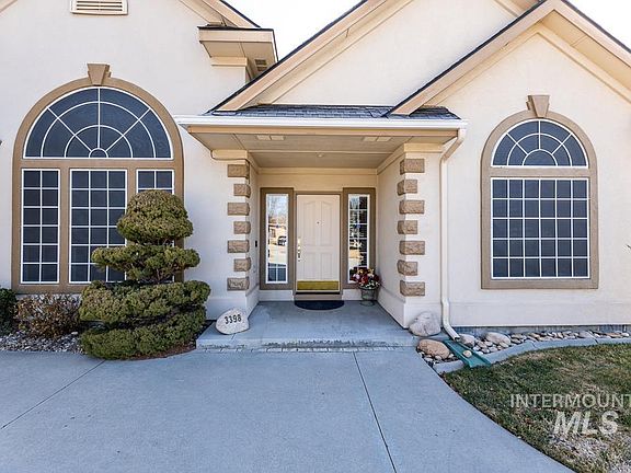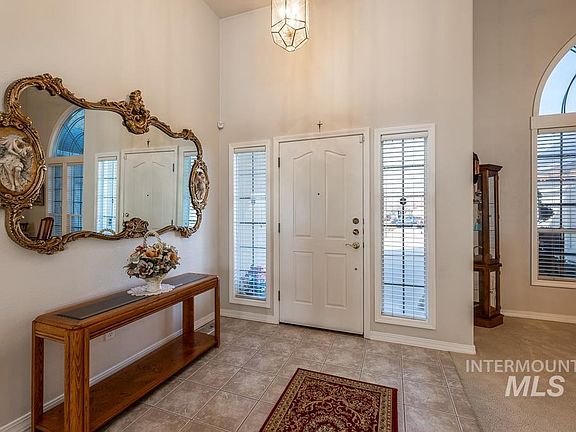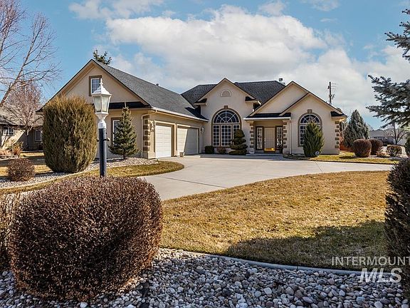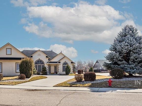 Come see this stunning single level home in one of Meridian's most desirable neighborhoods. This custom built home shows attention to detail in every room. Inside your friends will be greeted by a large great room with high vaulted ceilings, windows galore and a mantled fireplace with built in bookcases. Pillars separate the formal dining area that is big and perfect for entertaining. The kitchen features an island, breakfast bar, large eating area, lots of counter space, plant shelves above, rich Mediterranean styled wood floors accented by stainless steel appliances and beautiful granite counter tops. This split bedroom design has a spacious secluded master that has vaulted ceilings, a big bathroom with dual sinks, walk in shower, jetted tub and walk in closet. The utility room has wood floors and a sink. The three car garage has storage shelves and a work bench for crafting. Relax under the covered patio that overlooks a well manicured yard with mature fruit trees. Make this your must see home.