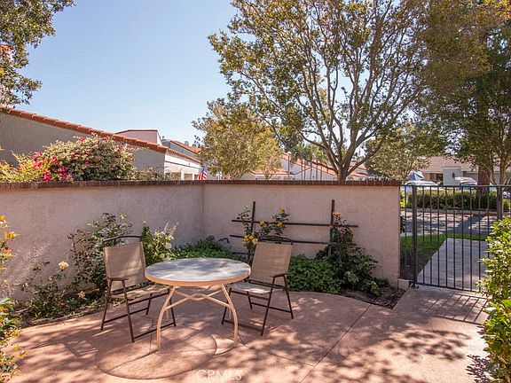 Lovely remodeled single-level, end-unit, three-bedroom, two-bath ANDALUZ residence in the Laguna Woods senior community. Situated at the end of a quiet cul-de-sac, this property is far from busy roads and noisy highways. The large front courtyard is beautifully landscaped with rose bushes and features an irrigation drip system. This is an ideal setting for outdoor entertaining, dining and relaxing. The spacious living room easily accommodates large furnishings. A bonus window as well as a solar tube has been added to the living room to allow more natural sunlight to enter. The living room also features direct access to the open rear patio. This patio looks onto a lawn and split rail fence and boasts a gorgeous panoramic view of endless trees. The highly upgraded kitchen features granite countertops, stainless steel appliances, cabinets with soft-close drawers, tasteful underlighting and a window that overlooks the front courtyard. The kitchen’s corner cabinets have stylish etched glass doors. The kitchen island comfortably seats up to three. There are two guest bedrooms (one with front patio access). Either of these guestrooms could serve as a home office, workout room, arts and crafts studio or any number of other uses. Additional upgrades throughout the home include smooth ceilings, crown molding and baseboards, recessed lighting, plantation shutters and dual-pane windows. There is attractive engineered wood flooring throughout the home and tile in both bathrooms. The oversized two-car garage contained additional built-in storage as well as washer/dryer hookups. The driveway can accommodate an additional vehicle and there is also guest parking in the cul-de-sac. Do not miss this exceptional property!