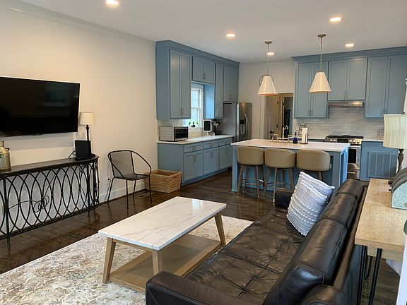 As you step inside, you'll be greeted by a spacious and tastefully decorated living area. The open floor plan seamlessly connects the living room, dining bar area, and fully equipped kitchen, creating a welcoming space for relaxing. The living room features ample seating and a large flat-screen 55" TV, perfect for watching a movie or streaming your favorite show.