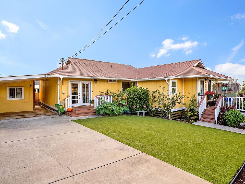 Welcome to your quintessential plantation style home conveniently located in the heart of Makawao Town. Built in 1947 and completely remodeled in 2017, enjoy the old Hawaii style charm with the updated conveniences of new appliances, new luxury vinyl plank flooring, blinds and a freshly painted interior. This 4 bedroom, 3.5 bath home offers a rare investment property opportunity to live in the 3 bedroom, 2 bath main house and to rent out the attached studio. Three lanai's with Trex decking provide private outdoor living space, and the zero maintenance Syn Lawn front yard is fenced-in and surrounded by a hibiscus privacy hedge. A covered carport and two separate driveways provide ample parking. An additional locked storage room and a separate laundry room are attached to the carport. 34 Ai Street is ideally located just moments to boutique shops, cafes, restaurants, art galleries, schools and the Eddie Tam recreation fields in Makawao.