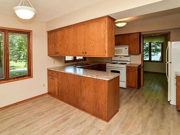 Ideal elevation with this rustic cedar gem on Buffalo Lake! Over 1 acre, this sprawling lot with mature maple and birch trees provides the perfect lake opportunity with 100 feet of hard sand/gravel bottom shoreline! Classic "Walkout Rambler Style", this spacious home offers many updates; furnace, AC, water heater, Wilsonart HD counter top, Karndean wood effect vinyl plank flooring, some new carpeting and bathroom fixtures. Cozy wood burning FP up, and convenient gas FP in the LL family room.