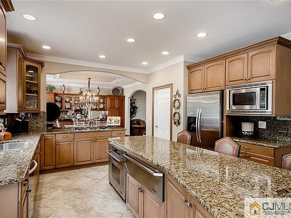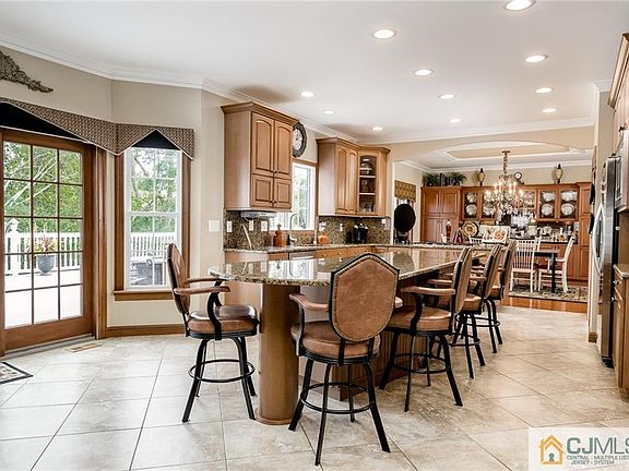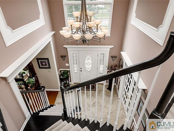 Three finely-finished floors and perfect entertaining flow allow this impressive Monmouth Junction Colonial to reinterpret tradition in a modern way. The foyer has a thoughtful drama with intricate molding and 2 stories of windows, and fans to a study/bedroom and a formal living room. A pull-up granite-topped island in the adjoining gourmet kitchen keeps the cook in the mix; modern amenities include stainless appliances, and walk-in pantry. A wood-burning fireplace beckons from the open, vaulted family room. Summer sparkles out on the wide deck, with a screened gazebo. The finished basement with separate exterior entrance is the ultimate play zone, a U-shaped wet bar, rec rm and separate gym, and full bath. The luxury master suite is an end-of-day sanctuary with a 2-sided fireplace shared by a large sitting room. 3 more upstairs bedrooms share a hall bath. 3 car attached garage and additional 2 car detached garage. Home is equipped with solar panels (owned not leased).