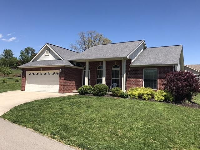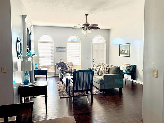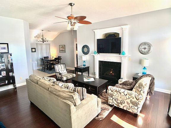 Contemporary one level home in The Lakes of Hickory Pointe subdivision. This 3 bedroom, 2 bath home features fresh light gray paint, spacious rooms, open concept floorplan, vaulted ceilings in the living and kitchen areas and an attached garage. It is move in ready. The outside living space is darling and perfect for relaxing. House is at the end of a cul-de-sac. There is a nice playground and a clubhouse that residents have access to.