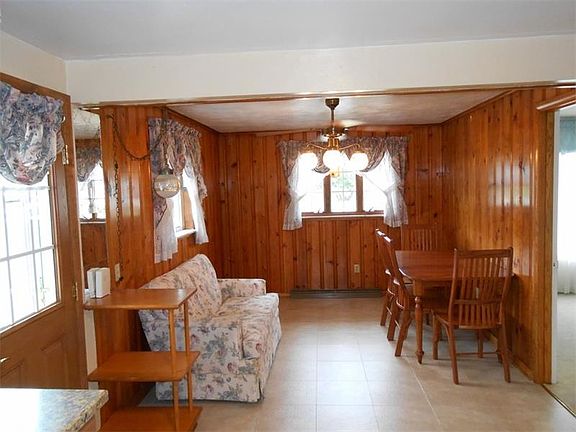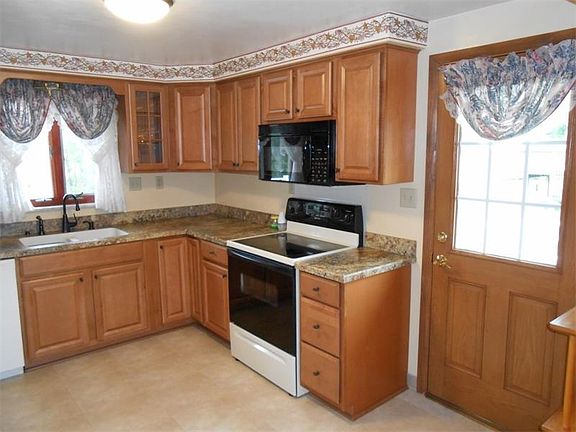 Beautiful level entry landscaped ranch on half acre lot. Features public water, updated custom equipped kitchen with new floor, huge living room with gas fireplace, master bedroom with french door to deck, many updates include roof, windows, painting, entrance doors, hot water tank, flooring. Enjoy the spacious updated deck overlooking the countryside. Long concrete drive for extra parking and concrete walk all around the house. Unfinished lower level with area for bath and 22x11 game room with wood burner. Oversized garage and shop. Hardwood floors being refinished.