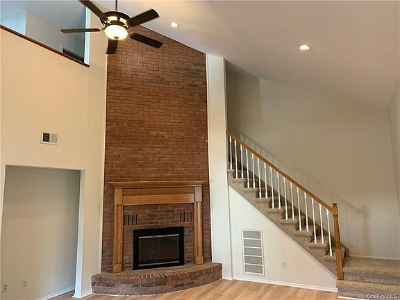 Wonderful 3 bedroom 2 bath, two story end unit with privacy! Two bedrooms and full bath located on the first floor. Second bedroom/loft and bath are upstairs. Sliders lead to private patio! Dramatic 2 story brick fireplace in living room! Laundry on main level and 1 car garage as well as lot parking.