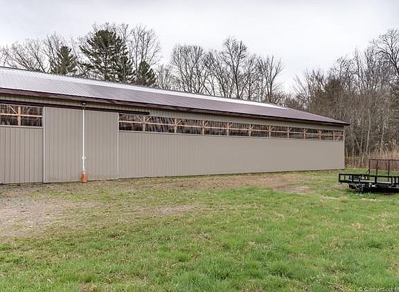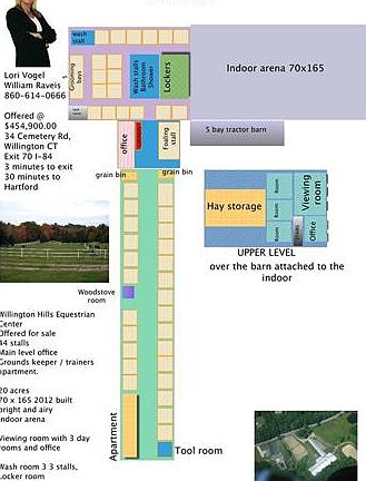 Diamond in the rough. 44 stall Equestrian Facility offers a great opportunity to own. The 70x165 indoor arena was re-built in 2012. It is bright and airy. There are 2 large barns and an indoor arena that all attach so access to the to the various areas are easy and always inside. No walking out in the rain blazing sun or snow. Once upon a time this facility was state of the art. Currently there is a good amount of deferred maintenance but the price reflects that. A floor plan of the barns is attached for review and an understanding of just how much there is to work with. A huge client locker room exists, one that anyone would envy. The wash room has 3 large bays, again I personally would love this at my facility. There is also a 4th wash stall in a the corner of the back barn. The upper loft is 35x47 and has easy access for loading hay so you can load your barn during hay season and save $$$. There is a 2nd level 21x15 viewing room with an office and 3 day rooms. (no photos yet) A main level office, foaling stall and tack room.(photos coming) The old saying location, location, location . Just 3 minutes off I-84, exit 70 and 25 minutes to Hartford this facility offers location and opportunity. oh yes and don't forget 20 acres, established pastures, paddocks, pond and nice wide on property trails. Great for a hunt course. Call for more info or to talk.