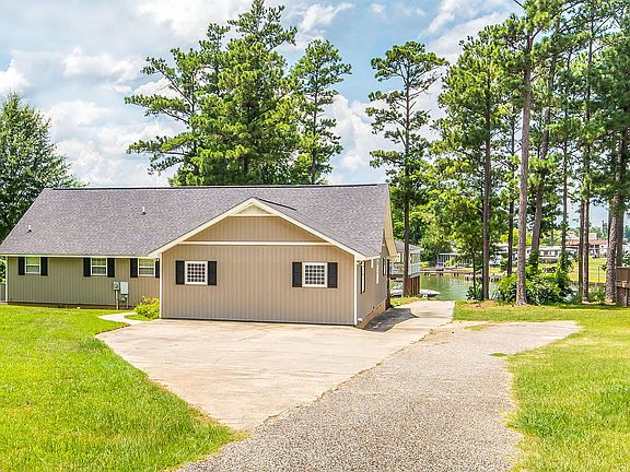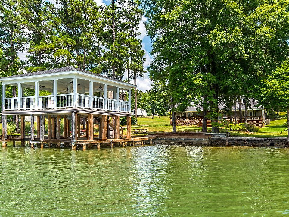 No stairs at this home. One story large 2400 sq. ft. 5 bedrooms-6 bath. home with many rooms. Plenty of room to spread out. Great flat lot for kids to play. Everyone has their own bathroom. Beautiful wood floors. Fireplace. Lake style updated interior. 720 sq.ft. covered porch off kitchen. Enormous 2 story covered dock. Great private swimming area and your own paved boat ramp! Covered Porch with ceiling fans -Facing Water -720 sq. ft. Private paved Boat Ramp Boat House with covered Pavilion Double boat house covered slips with electronic boat lifts Large level lot with approximately 1.7acres. Furnished Ready 77 feet water frontage AC unit fairly new New roof New sliding and shutters Baby bedroom space