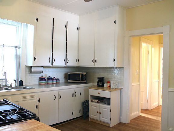 Spacious Kitchen with plenty of cabinets and countertop space, appliances include a gas stove, refrigerator, microwave and sink with disposal.
