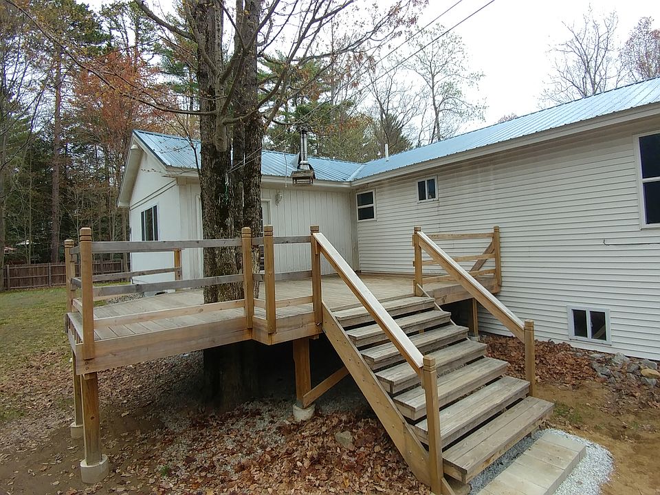 APPEALING TWO LEVEL CONWAY HOME SET ON 2.33 ACRES OF PRIVATELY-SITUATED LAND WITH A GORGEOUS BROOK! House features four bedrooms (including a new primary suite), one full and one 3/4 bath, and a spacious kitchen/dining/living area. Kitchen boasts an abundance of wood cabinets, granite countertops, new stainless appliances, plus a newly-installed island bar with a butcher board counter. The kitchen opens to a large dining area on one side and into the living room with two walls of glass, which looks to the private backyard. Main level also features a primary bedroom suite and second bedroom. All new vinyl plank flooring and freshly painted walls. Wood rosette trim on all windows and doors. Walk-in level includes two bedrooms, a family room, utility room, and one car garage. The land is lovely with a year-round brook rambling through it. Firepit and sitting area as well as deck off living room highlight spaces for outdoor enjoyment. Convenient Conway location in a wonderful residential community close to the village, the Kancamagus Highway, and all valley recreation, shopping, and fun activities.