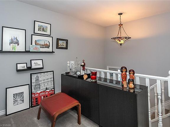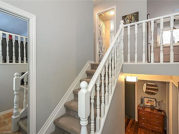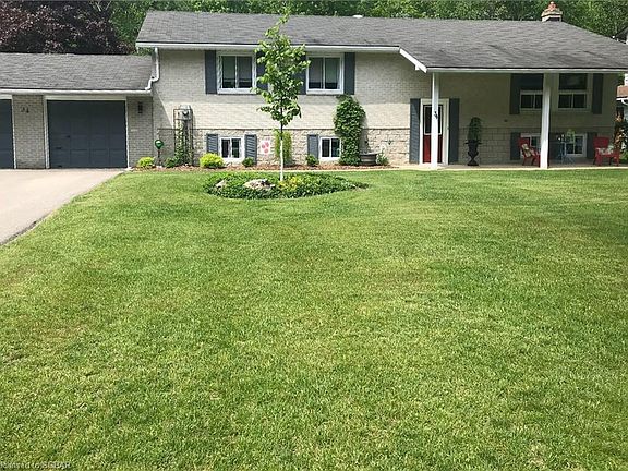 Check out this great 4 bedroom 3 bathroom home on a large 110' x 141' fully serviced lot backing onto wooded area and trails. This home has had many new renovations in the past 4 years, new kitchen and quartz countertops, 3 new bathroom, new high efficiency windows, new heat pump and air conditioning unit. Great space with open concept kitchen to dining room, 3 bedrooms on the main and 2 bathrooms, walk out from dining room to fully fenced in private yard plus large deck, plush green grass and sprinkler system. Lower level has large family room with gas fireplace and bar, bedroom and office area and a new 3 piece bathroom. Handy walkup to the garage from the lower level. Property still has a working well with tap at the back of the home. You will not be disappointed with this home, nothing left to do but move in and enjoy!