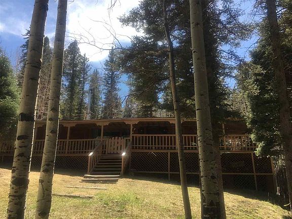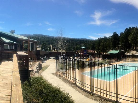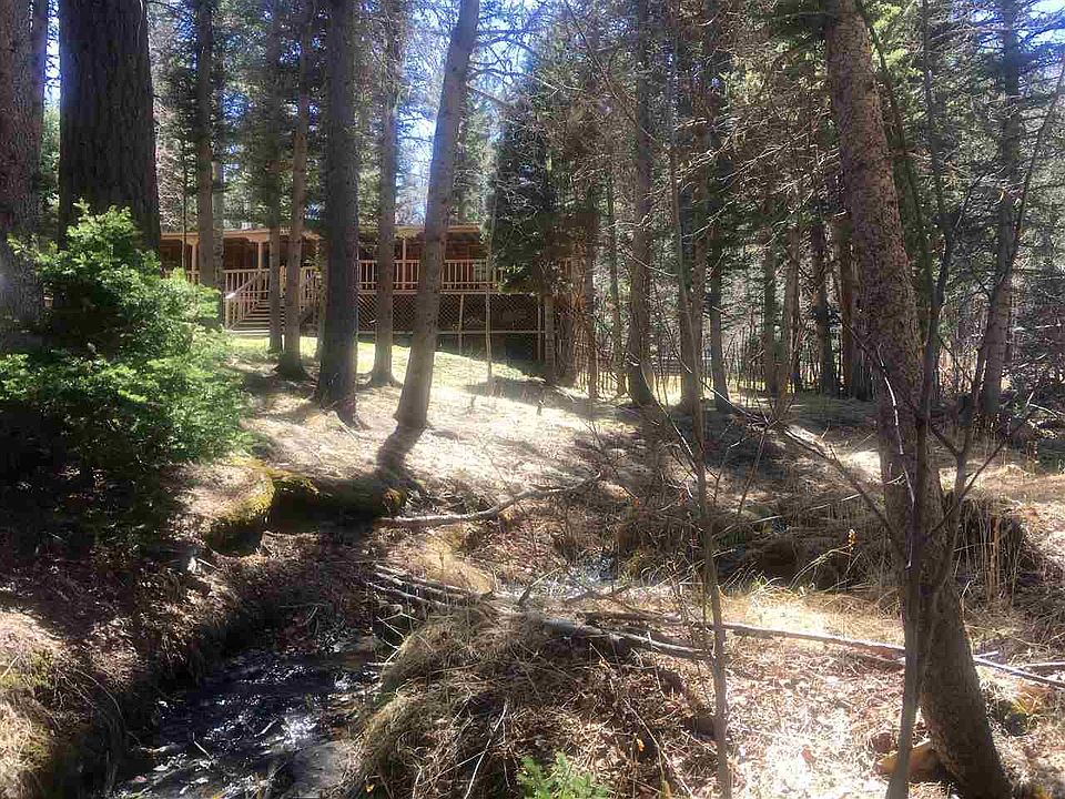 Watch the stream flowing through the huge pines from the porch or listen to it from the bedroom! The stream feeds the Class A trout fishing pond across the street. This comfortable cabin is an outdoor enthusiasts/nature lovers' dream. As part of the El Valle Escondido Community of 140 families it boasts a 9-hole green (no pesticides) golf course, fishing lake, a community center with pool and deli and it backs up to national forest where you can explore trails by foot, bike, atv or skis! This remodeled home has 3 bedrooms and 2 baths, both have been professionally remodeled with granite showers and countertops with double sinks and the master bath has a jacuzzi tub and walk-in closet. The kitchen has also been remodeled with high-end granite and has a dishwasher, refrigerator and range. The living room features a fireplace with a granite surround. There is a washer and dryer. The large porch wraps around two sides with a small porch in the back. HOA dues are $1550/year and includes water, road maintenance, golf course, trout fishing pond, children's playground and community pool. There is a $3,000 transfer fee paid by buyer upon closing. Fifteen minutes from Angel Fire Ski Resort and more golf! About an hour drive to Taos Ski Valley. This is not just a home, but a family community and outdoor recreation area with unlimited possibilities for fun.