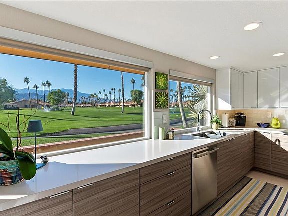 LOCATION, VIEWS, TOTALLY RENOVATED + PAID SOLAR! Welcome to your dream home in Chaparral CC where luxury meets spectacular panoramic views of the San Jacinto Mountains, the lake & greens of the 15th & 16th holes. Immediately you are captured by beautiful accent lighted custom landscape and the much sought after 3rd car garage. This stunning 3-Bed, 3-Bath estate offers over 2,100 sq.ft. of elegance and comfort. Inside, natural light pours through new high efficiency windows and sliders, illuminating the open floor plan with its luxury ceramic tile flooring and sophisticated design. The expansive family room, atrium converted to private office, & open concept dining room create the perfect spaces for relaxation and entertainment. The gourmet kitchen is a chef's dream, featuring a massive island, quartz countertops, double ovens, gas range, warmer drawer, under cabinet lighting and ample storage. Two primary bedrooms with ensuites await. The 1st Bdrm offers a spa-like bathroom with dual sinks in matching quartz countertops and a walk-in closet, while the 2nd Bdrm is perfect for guests or as a game room. The 3rd Bdrm has direct access to the 3rd bath. Other features include new washer/dryer, new FAU, A/C, water heater w/heat pump, new ceiling fans, Solar lights, Epoxy garage floor & quality cabinets. This is the unit you have been waiting for; Enjoy viewing the snowcapped mountains from your extended patio with privacy wall & watch the golfers hit over the lake on hole #16.