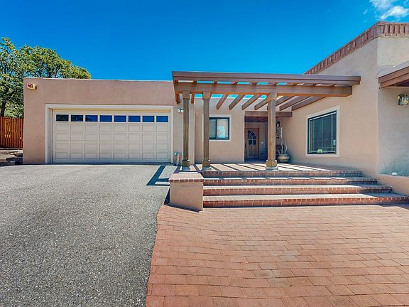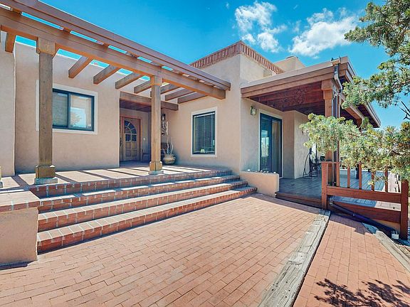Nestled amid five private acres of piñons and ponderosa pines sits this warm and welcoming Territorial Pueblo home. Venture up a few steps to the front door and entry. From there, you are on one level or can step down to the living room/dining area, where your eyes are immediately drawn to tall windows and the spectacular western views overlooking Santa Fe, which are even more enjoyable from the wrap-around portal, a perfect perch for reveling in views and sunsets. High beamed ceilings with wood decking, a Rumford-style fireplace, and a wet bar encompass the large living room/dining room area. The inviting kitchen has original appliances, an extensive Wolfe commercial range, two dishwashers, two sinks, a Sub-zero refrigerator and freezer, a pantry, a work island, and a casual dining area with a broad picture window—a perfect kitchen for entertaining large parties and multiple cooks. Skylights and Saltillo tile add touches of Southwestern charm and style. Down a long hall with several storage closets is the laundry room with a utility sink and storage cabinets, two guest bedrooms, and a full bath. At the end of the hall is the primary bedroom. It has a wood-burning fireplace and accesses an open-air wood deck among the trees, allowing for sunny relaxation or stargazing. Other highlights include a spa-like primary bathroom with a large jacuzzi/hot tub, shower, bathtub, dual sinks, and walk-in closet. The oversized garage has room for a workshop area and tandem parking for 3-4 vehicles. Membrane roof.