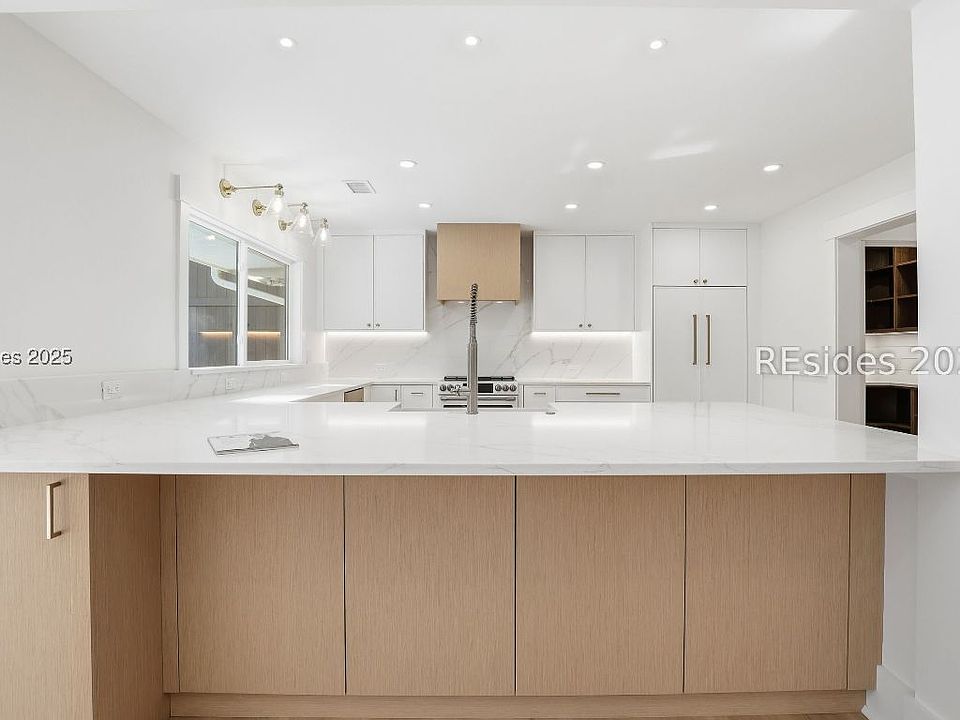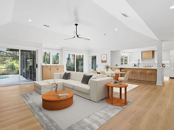 Completely reimagined from the studs up, this Hilton Head Plantation masterpiece blends modern sophistication with timeless Lowcountry charm. Offering 2,623 square feet of refined island living, the home's fresh coastal-chic design and wide-plank hardwood floors flow seamlessly through every space-all overlooking the serene third green of Bear Creek Golf Club. Thoughtfully redesigned for contemporary comfort, the residence showcases new high-end finishes throughout, from designer lighting and custom cabinetry to premium fixtures and appliances. Natural light pours into open, airy interiors where the great room's gas fireplace and built-ins complement the chef's kitchen-featuring a spacious island, marbled Quartz countertops, panel refrigerator, beverage fridge, and a hidden back pantry. Every detail reflects a harmonious balance of modern elegance and coastal warmth. The single-story layout offers effortless living, extending into a tranquil office/flex room and two guest bedroom with beautifully finished jack & Jill bath. The primary suite is a private retreat, with a soaring tray ceiling, direct access to the screened lanai, and a spa-inspired en suite bath boasting dual vanities and a stunning walk-in shower wrapped in custom stone.Outside, resort-style living awaits. A sparkling and newly refinished swimming pool shimmers beneath a canopy of mature trees, fully screened for year-round enjoyment and minimal maintenance. Expansive patio provide space for grilling, dining, and entertaining-all framed by peaceful golf views and lush privacy. Every inch of this home reflects its complete structural and aesthetic transformation-a meticulous renovation that brings new life, beauty, and lasting value. With its elevated finishes, serene setting, and inspired design, this HHP gem captures the essence of Hilton Head Island living at its finest.
